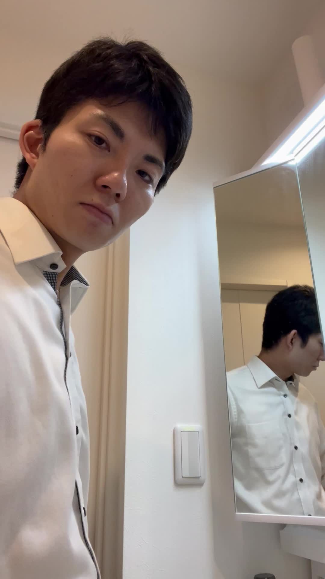 鏡の前でジャケットを着てポーズを決め、「準備は整った」風の決意を見せる動き